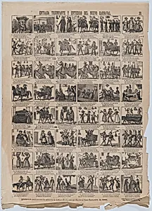 Broadside with 48 scenes depicting the triumphal entry and burial and entry of the new carnival