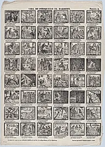 Broadside with 48 scenes from the life of Periquillo the Barber