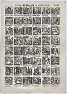 Broadside with 48 scenes illustrating the story of Urganda the Unknowable by Juan Llorens