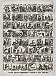 Broadside with 48 scenes relating to the life and cunning of the peasant Bertoldo