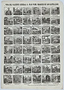 Broadside with 48 scenes relating to the life of General Juan Prim y Prats, 1st Marquis of Los Castillejos