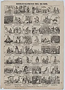 Broadside with 48 scenes showing extravagances of the world by Juan Llorens