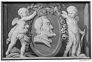 Bust of Henri IV in oval medallion with blue ground supported by two cupids