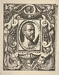 Bust portrait of Cosimo I de' Medici, in an oval frame set within a rectangular plaque, surrounded by fantastical ornament