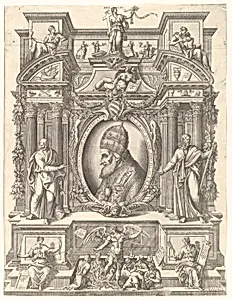 Bust portrait of Pope Pius V in profile facing left set within an elaborate architectural structure upon which sit allegorical figures including Faith, Charity and Religion above and Justice and Prudence below who flank St Michael