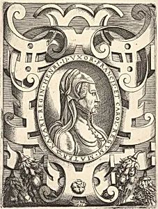 Bust profile portrait of Catherine de' Medici in an ornamented frame,from 'Portraits of some princes and illustrious people' ('Ritratti di alcuni prencipi, et huomini illustri'; also titled 'Imagines quorundam principum et illustrium virorum'), published by Bolognino Zaltieri in Venice in 1568