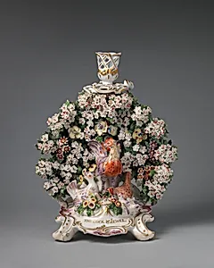 This elegant candlestick, one of a pair produced by the renowned Derby Porcelain Manufactory around 1769–70, exemplifies the height of 18th-century British ceramic artistry. Crafted from soft-paste porcelain—a delicate, European imitation of Chinese hard-paste porcelain—its creamy white body stands 10¼ inches tall, perfect for illuminating grand dining tables or drawing rooms of the Georgian elite. Derby, founded in 1750, quickly rose to prominence for its finely modeled figures and ornate decorative wares, blending technical innovation with naturalistic designs. Adorned with lively chickens ...