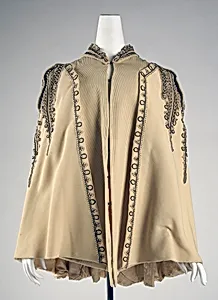 Step into the opulent world of late 19th-century American with this exquisite cape, crafted around 1890 by an unknown. Made from a luxurious blend of wool, silk, and metallic threads, it exemplifies the era's emphasis on rich textures and shimmering surfaces. Wool provided warmth and durability for outerwear, while silk and metallic elements added a touch of glamour, catching the light to evoke sophistication and status. During the Gilded Age, capes like this were essential wardrobe staples for women, offering both practicality and elegance over daytime or evening ensembles. This American piece reflects the transatlantic influences of the time, where European couture inspired bold, decorative designs amid rapid industrialization and social change. Its presence in the Metropolitan Museum of Art's Costume Institute highlights the cultural value of everyday luxury garments in documenting personal style and societal norms. Generously donated as a gift from Mrs. John C. Cattus in 1952, this cape invites visitors to ponder the lives of its original wearers—perhaps strolling city streets or attending grand affairs—preserving a tangible slice of America's fashionable past.