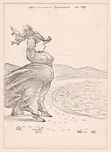 In the summer of 1893, Sir Edward Burne-Jones, leading figure in the Pre-Rapite Brotherhood and Arts and Crafts movement, captured a whimsical moment on the pebbly shores of Rottingdean,. This *Caricature of a Windown Woman on the Beach Rottingdean* a gusty seaside encounter, with a woman's skirts and hair dramatically tousled by the wind. Rottingdean, a village near Brighton, was favored retreat for Burne-Jones, where he often escaped the bustle of London to sketch en plein air, revealing a playful side to an artist renowned for his ethereal, medieval-inspired paintings. Executed in black ch...