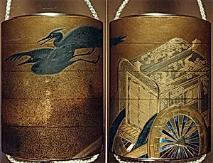 Case (Inrō) with Design of Imperial Cart and Flying Herons (obverse); Court Carriage and Flying Herons (reverse)