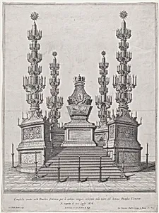 This etching captures the grandeur of the catafalque erected for Clement X's funeral in 1676, a temporary monumental structure symbolizing mourning and papal splendor. Designed as the central feature atop a towering fifteen-step platform, it features elegantly draped columns at each of its four corners, crowned with ornate candelabra that flicker with symbolic light in the imagination. Created by master engraver Giovanni Battista Fal, with publication by the Rossi brothers—Giovanni Giacomo and Giovanni Battista de'—this print preserves an ephemeral Baroque spectacle in the heart of Rome. Fald...