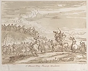 Cavalry advancing to the charge, with a central figure on horseback raising a sword