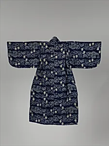 紺麻地松竹梅扇面模様子供用着物|Child's Kimono with Pine, Bamboo, Plum Blossoms, and Fans