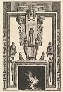 Chimneypiece in the Egyptian style: Mummy superimposed on a large caryatid above the lintel (Ch. à l'égyptiennne surmontée d'une grande cariatide contre laquelle s'applique une momie), from Diverse Maniere d'adornare i cammini ed ogni altra parte degli edifizi...(Different Ways of ornamenting chimneypieces and all other parts of houses)