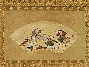 Step into the playful world of Kano Motonobu's *Chinese Boys at Play*唐子遊び図扇面 a gem from Japan's Muromachi period (1392–1573). in the first half of 16th century, work by the master of the Kano school—a pioneering professional painting lineage—originally graced a folding fan before being elegantly mounted as a hanging scroll Measuring about 9 x 18 inches in its fan form, it showcases Motonobu's skill in ink, vibrant colors, gold flecks, and shimmering mica on paper, transforming a portable accessory into a luxurious wall display. The scene bursts with energy: Chinese-style boys (karakara or tan...
