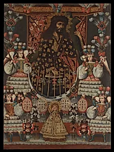 In the heart of colonial Peru's Cuzco School, this striking painting, *Christ Carrying the Cross, "The Lord of the"*, captures a pivotal moment in Christian iconography around 1770–75. Created by an unknown artist, it depicts Christ bearing his cross, surrounded by angels—a common motif in Andean religious art that blends European Baroque drama with local devotional fervor. The generous use of oil and gold on canvas, measuring an imposing 65 × inches, creates a luminous, otherworldly glow, drawing viewers into the sacred narrative. Gold leaf, a hallmark of Cuzco painting, not only signifies h...