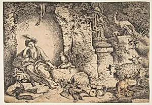 In the enchanting etching *Circe with the Companions of Ulysses Changed into Animals* (1650–51), Giovanni Benedetto Castiglione, known as Il Grechetto, captures a pivotal moment from Homer's *Odyssey*. The sorceress Circe, surrounded by the ruins of her palace, presides over Odysseus's transformed crew—now a menagerie of peacocks, deer, sheep, and other beasts. Created during the Italian Baroque era, this print draws on classical mythology to explore themes of enchantment, power, and the blurred line between human and animal, resonating with 17th-century fascination with ancient tales amid the...