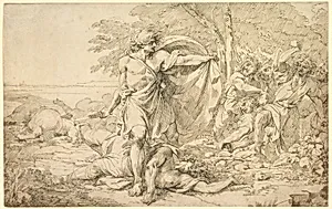 John Hamilton Mortimer (17401779), a pioneering British artist bridging Rococo elegance and emerging Romanticism, created this evocative drawing titled *Classical Subject: Possibly the Aftermath a Battle* sometime between 1760 and 1779. Mortimer was celebrated for his dramatic history scenes and character studies, often drawing inspiration from ancient myths and battles to evoke pathos and heroism. This work captures a poignant moment amid fallen warriors—likely Roman or Greek soldiers—highlighting the human cost of conflict through clustered figures in dynamic poses. Executed in pen and blac...