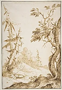 Marco Ricci (1676–0), a Venetian painter draughtsman, masterfully captured the tranquil beauty of nature in *Clearing in a Wooded*, a delicate drawing from the early 18th century. for his atmospheric landscapes and *vedute*—topographical views influenced by the rising interest in the natural world during the late Baroque period—Ricci often blended real observation with imaginative elements. This intimate sheet, measuring just 11½ × 7⅞ inches, depicts a sun-dappled clearing ringed by dense trees, evoking a sense of peaceful retreat amid the wilderness. Executed in pen and brown ink over faint ...