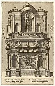 In the intricate etching *Cœnotaphiorum (21)* from 1563, Dutch artist Hans Vredeman Vries, a master of Northern Mannerist architecture and perspective, teams up with the renowned engraving brothers Johannes and Lucas van Doetecum. This first-state impression—rare among its four states—measures a compact 9 1/16 x 5 13/16 inches belongs to a series exploring fantastical cenotaphs, or monumental empty tombs. Housed in the Metropolitan Museum of Art's Drawings and Prints department, it exemplifies the era's fascination with elaborate ornamental designs inspired by classical antiquity. The composi...