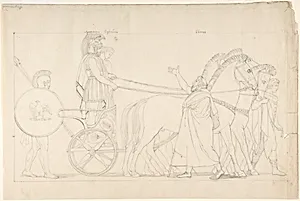 John Flaxman's *Composition from the Traged of Aeschylus, 17 (recto); Goddess Statue from the Supants, plate 7 (verso)* is a double-sided graphite drawing from the 19 century, now housed in the Metropolitan Museum Art's Department of Drawings and Prints. the recto, Flaxman sketches a dynamic scene likely evoking the ancient Greek tragedies of Aeschylus, featuring, horses, and chari in fluid, linear compositions that pulse with dramatic tension. The verso presents a serene goddess statue from *The Suppliants*, one of Aeschylus's earliest surviving plays, where the daughters of Danaus plead for ...