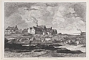 Country landscape with a river running at right and houses in the background