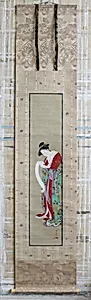 In the vibrant world of Edo-period Japan (1615–1868), Katsukawa Shunshō captures a moment of quiet introspection in *Courtesan a Letter*. This th-century hanging scroll depicts a poised courtesan from the Yoshiwara pleasure district, immersed in a private letter. Shunshō, a leading ukiyo-e artist renowned for his bijin-ga (images of beautiful women) and actor portraits, masterfully blends realism with elegance, evoking the "floating world" of urban pleasures and fleeting emotions. Rendered in ink and color on silk, the work exemplifies traditional Japanese scroll painting techniques. The vert...