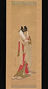 In the vibrant world of Edo-period Japan (1615–1868), Chōbunsai Eishi (1756–1815) captured the elegance of the "floating world" with *Courtesan with a Letter Her Mouth*. This hanging scroll, rendered in ink and color on silk, exemplifies ukiyo-e artistry, a genre celebrating beauty, pleasure, and transience. Eishi, renowned for his bijin-ga ( of beautiful women), specialized in graceful depictions of courtesans from Yoshiwara, Tokyo's famed pleasure district. The intimate scale—32 1/16 × 10 3/16 inches—invites viewers into a private moment, where the woman poised with a letter suggests secrets...
