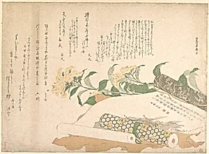 **Daisies and Twoimono** is a delicate woodblock print (surimono) by Kitao Shigemasa, a ukiyo-e artist Japan's Edo period (ca. 1800). Shigemasa, known for his refined illustrations and prints blending nature and everyday elegance, captures a serene still life of blooming daisies alongside two makimono—traditional Japanese handscrolls. Measuring 15 x 20 inches, this ink and color on paper work exemplifies the exquisite craftsmanship of surimono, privately commissioned prints often created for poetic gatherings or New Year's celebrations. Produced during the vibrant Edo era (1615–1868), when wo...