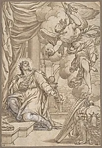 Pen and brown ink, brush and brown wash, heightened with white. Contours indented for transfer. Lined.