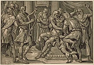 chiaroscuro woodcut printed from 4 blocks: black line block and three tone blocks in shades of gray-green on laid paper