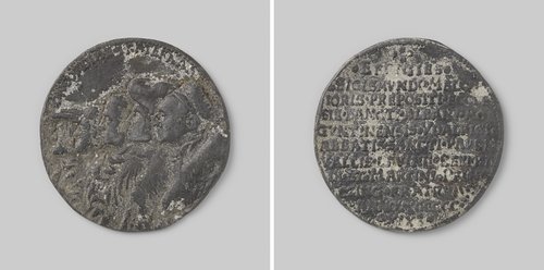 Loden penning. Voorzijde: borststuk van vijf mannen binnen omschrift. Keerzijde: opschrift.