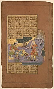 This exquisite folio, titled *Death of Farud*, comes from a *Shahnama* (Book of Kings), the monumental Persian epic poem composed by Abu'l Qasim Firda around 1010 CE. Dating to circa 1610, it a dramatic moment from the epic's tales of ancient Iranian kings and heroes, where Farud meets his tragic end amid themes of valor, betrayal, and mortality. As part of the Safavid-era manuscript tradition, such folios were prized treasures, blending poetry with vivid illustration to preserve Iran's mythic history for royal courts and scholars. Rendered in ink, opaque watercolor, and gold on paper, the mi...