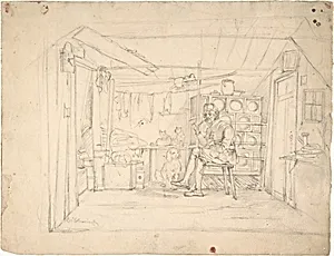 Lead pencil, shadows on the figure seem to be reinforced with black ink; spots of pigment at upper corners and at lower margin