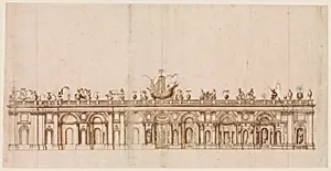 Giovanni Guerra's *Design after a Fountain in Villa Aldobrandini Frascati* (c. 1590–1600) the grandeur of one of Renaissance Italy's most celebrated garden spectacles. The Villa Aldobrandini, perched in the hills near Rome, was a pinnacle of Mannerist landscaping, where engineering marvels like hydraulic fountains blended architecture, sculpture, and illusionistic water features. Guerra, a Bolognese artist active in Rome, meticulously rendered this design, likely as a study or record, highlighting the villa's innovative fountains adorned with architectural elements and nautical motifs like shi...