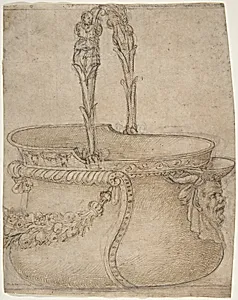 Design for a Bucket-Like Vessel with a Handle of Two Interlaced Captives, on a Body Adorned with a Scroll, Garland, and a Spout with a Satyr's Head