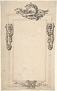 Design for a Cartouche or Frame with Four Groups of Military Ornament: Flames and Thunderbolts on bottom; Swags of Bombs at Sides; Sword, Baton, and Laurel Top.
