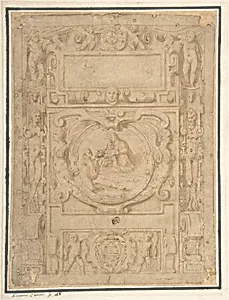 Design for a Cartouche with the "IHS" Monogram of the Society of Jesus, Putti, Fantastick Creatures, at the Borders, a Central Scene of the Virgin and Child with a Monastic Figure, and the Family Arms of a Cardinal