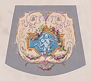 This delightful design for a chair seat cover, by an anonymous French artist around 1870–1900, captures the exuberant spirit of 19th-century arts. Rendered in and gouache on a sheet measuring 15 1/16 × 9 7/16 inches, it features two playful wrestling putti—chubby, mischievous cherubs—framed by cascading garlands of leaves and flowers. These lively figures nestle within a larger ornamental border highlighted by a prominent heart-shaped, evoking romance andy. In late 19th-century France during the opulent Second and early Belle Époque, such preparatory drawings were essential for luxury furnitu...