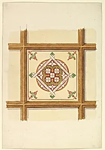 Design for a Coffered and Painted Ceiling in Rust and Olive Green, with a Quatrefoil Motif