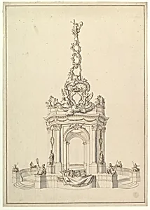 Design for a Festival Monument: Base Holds a Small Orchestra; Triumphal Arch Surmounted by a Cartouche-Decorated Pyramid with Figure of Fame, below, a Royal Crown.