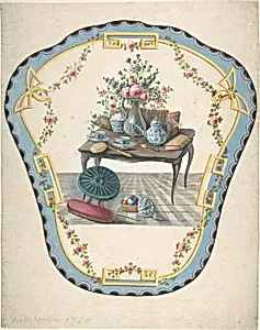 Design for a Firescreen with a Table with a Vase of Flowers, Books, and Teapot