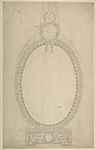 Design for a Girandole Mirror, an Oval Resting on an Oblong Base, Terminated by Two Superimposed Circular Frond-motifs, Topped with a Lion's Head from Which Hang Floral Swags and Pendants