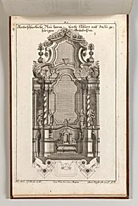 This exquisite etching, *Design for a Monumental, Plate i* from Johann Michael Leüchte and Engelbrecht's album *Unterschiedliche Neuierte Altäre mit darzu gehörigen Profillen. Grundrißen* (ca. 1750–56), showcases an elaborate Baroque-inspired altar design destined for grand ecclesiastical spaces. Printed on a modest sheet measuring 8 7/16 × 13 3/4 inches, it features intricate architectural details, profiles, and ground plans, builders and artisans to replicate its soaring columns, sculpted niches, and ornate baldachin. Created during the Rococo era in German-speaking Europe, this plate exemp...