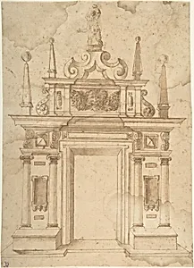 This exquisite *Design for a Triumphal*, created by an anonymous Italian artist between 1500 and 1700, captures the grandeur of Renaissance and early Baroque architectural imagination. Triumphal arches, inspired by ancient Roman monuments, were temporary structures erected for festive occasions like royal entries, weddings, or military victories. In Italy during this period, they symbolized civic pride and classical revival, often adorned with sculptures, inscriptions, and allegorical figures to celebrate patrons or events. Rendered in pen and brown ink with brush and brown wash over faint le...