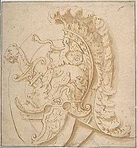 Design for a Trophy with Sword and a Plumed Helmet Decorated with Grotesques Masks, Classical Motifs.