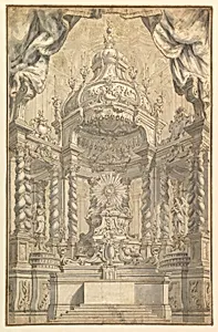 This exquisite anonymous drawing from 18th-century Piedmont, Italy, offers a glimpse into the opulent world of liturgical celebrations. Titled *Design for Altar Decorations a Liturgical Celebration*, dates to 1750–75 and depicts elaborate schemes for adorning church altars during sacred feasts. In Piedmont, a region blending Savoyard grandeur with Italian Baroque traditions, such designs elevated religious rituals, transforming altars into dramatic focal points with scrolling motifs, architectural frames, and symbolic flourishes that evoked heavenly splendor. Crafted in pen and brown ink with...