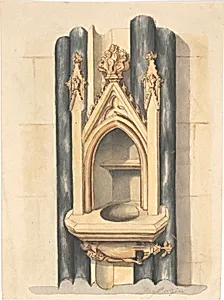 Design for baptismal font set between paired Purbeck marble columns