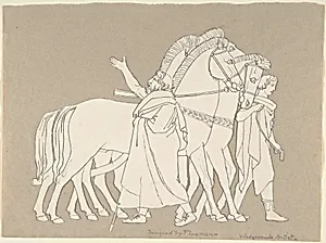 John Flaxman's *Design for Large Fireplace White Tiles Produced in Wedgwood's Factory* (19th century) is a delicate preparatory drawing that bridges fine art and industrial design. Rendered in pen and black ink over graphite on a modest mount (8¼ × 11⅜ inches), it features motifs of men and horses, evoking classical scenes likely inspired by ancient Greek or Roman narratives. As a neoclassical artist renowned for his sculptures and illustrations, Flaxman skillfully translated timeless motifs into functional designs. This work highlights Flaxman's pivotal collaboration with Josiah Wedgwood's f...