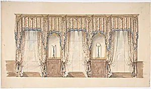 Design for Pink, Gold, Blue and White Curtains with Blue Fringes and a Gold and Wood Pediment